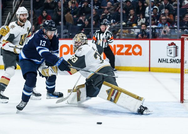 Winnipeg Jets' Gabriel Vilardi tries to get around Vegas Golden Knights goaltender Adin Hill during the second period in Winnipeg. The Golden Knights won 3-2 in overtime on Dec. 12, 2024.JOHN WOODS/The Canadian Press