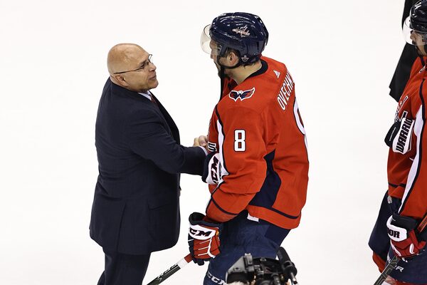 New York Islanders head coach Barry Trotz shakes hands with Alex Ovechkin of the Washington Capitals after their 2-0 victory in Game Five to win the Eastern Conference First Round at Scotiabank Arena in Toronto on Aug. 20, 2020.Elsa/Getty Images