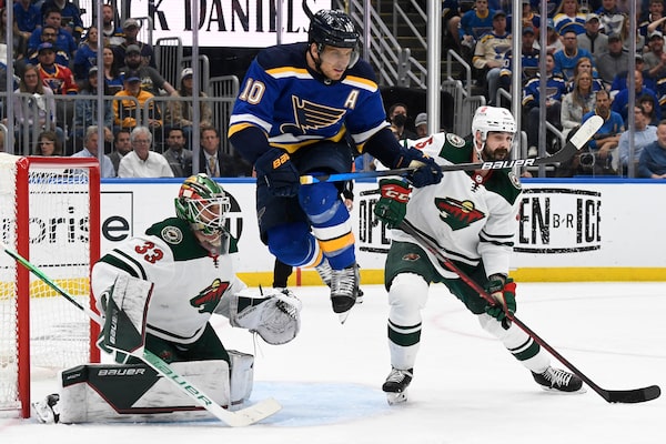 St. Louis Blues centre Brayden Schenn attempts to screen Minnesota Wild goaltender Cam Talbot during the second period in Game 6 of the first round of the 2022 Stanley Cup Playoffs at Enterprise Center. The Blues won 5-1 on May 12, 2022.Jeff Le/USA TODAY Sports via Reuters