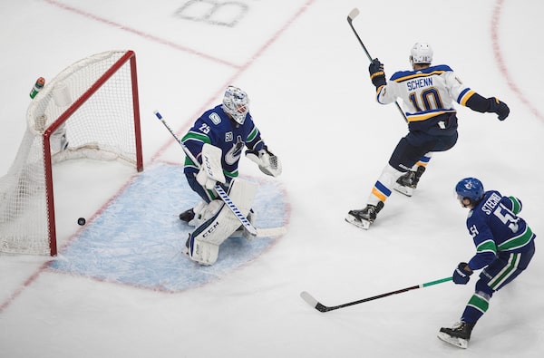 Vancouver Canucks goalie Jacob Markstrom (25) is scored on by St. Louis Blues' Brayden Schenn (10) as Troy Stecher (51) defends during overtime NHL Western Conference Stanley Cup playoff action in Edmonton, Sunday, Aug. 16, 2020.JASON FRANSON/The Canadian Press