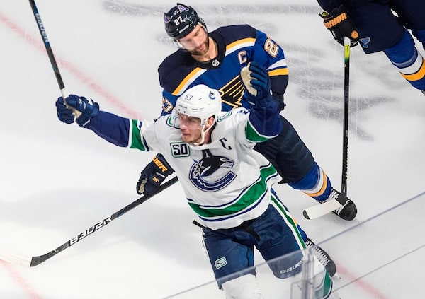 Vancouver Canucks' Bo Horvat (53) celebrates his goal as he is followed by St. Louis Blues' Alex Pietrangelo (27) during overtime in first round NHL Stanley Cup playoff hockey series in Edmonton, on Friday August 14, 2020.The Canadian Press