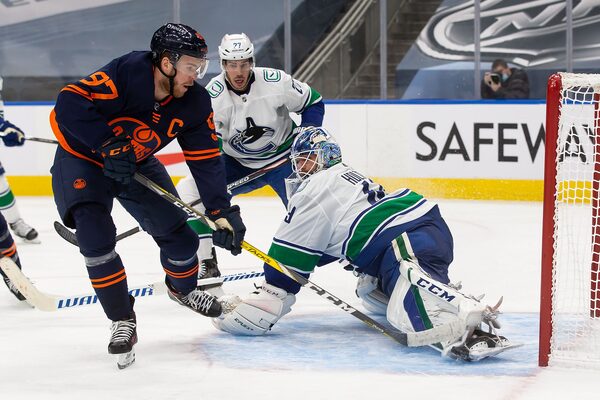 Vancouver Canucks goaltender Braden Holtby stops Edmonton Oilers captain Connor McDavid at Rogers Place on Jan. 13, 2021. The Canucks beat the Oilers 5-3.Codie McLachlan/Getty Images