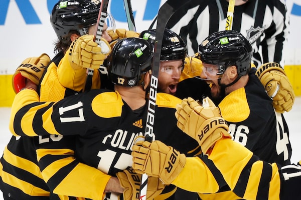 Boston Bruins' Matt Grzelcyk celebrates his goal against the Toronto Maple Leafs with teammates during the third period on Jan. 14.Michael Dwyer/The Associated Press