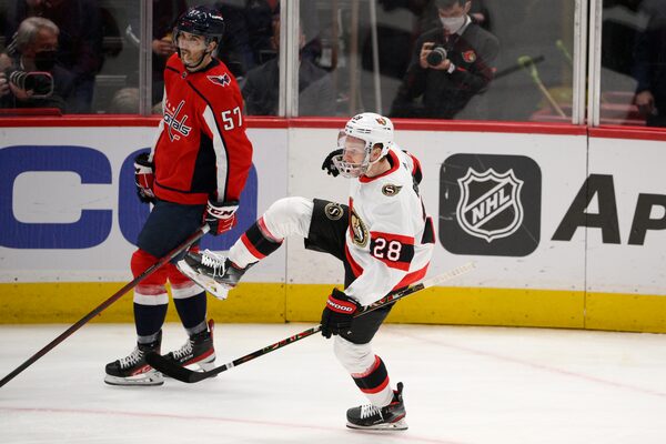 Ottawa Senators right wing Connor Brown (28) celebrates his goal next to Washington Capitals defenseman Trevor van Riemsdyk (57) during the third period of an NHL hockey game, Sunday, Feb. 13, 2022, in Washington.Nick Wass/The Associated Press