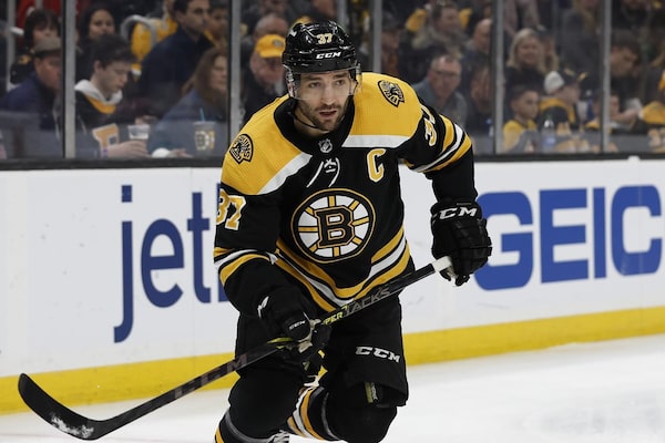 Boston Bruins captain Patrice Bergeron during a game against the Pittsburgh Penguins, in Boston, on April 16.The Associated Press
