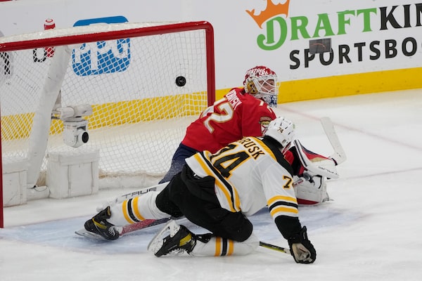 Boston Bruins left wing Jake DeBrusk (74) scores a goal against Florida Panthers goaltender Sergei Bobrovsky (72) during the second period of Game 4 of an NHL hockey Stanley Cup first-round playoff series, April 23 in Sunrise, Fla.Marta Lavandier/The Associated Press