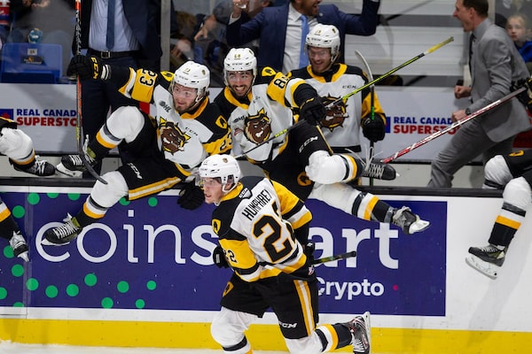 Hamilton Bulldogs' Mason McTavish, left, and teammates Mark Duarte and Ryan Humphrey jump over the boards after defeating the Shawinigan Cataractes 4-3 in overtime in the Memorial Cup semi, in Saint John, N.B., on June 27, 2022.Ron Ward/The Canadian Press