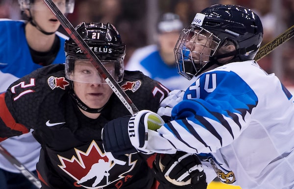 Owen Tippett of Team Canada fights for control of the puck with Ville Heinola of Finland during the pre-tournament game between the two teams.JONATHAN HAYWARD/The Canadian Press