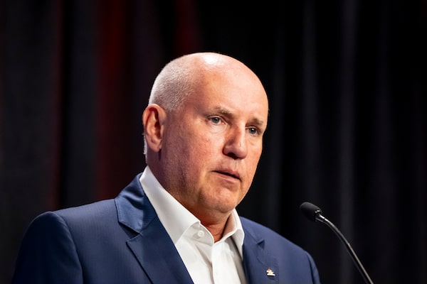 Doug Armstrong, general manager of Team Canada’s men’s Olympic hockey team, gives remarks before unveiling the roster for Canada's 2026 Olympic hockey team at a press conference in Minneapolis on Wednesday.Christopher Katsarov/The Canadian Press