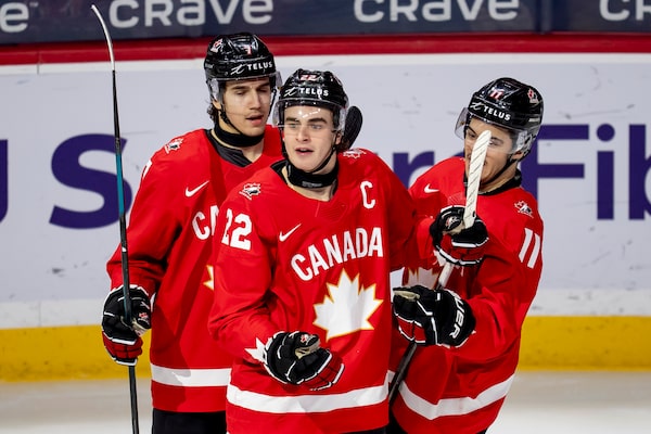 Canadian captain Porter Martone (22) celebrates with teammates Michael Misa (7) and Tij Iginla (11) after scoring against Finland at the world junior hockey championship third-place game in St. Paul, Minn., on Monday.Christopher Katsarov/The Canadian Press