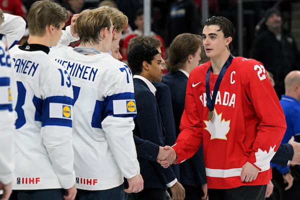 Canada forward Porter Martone (22) shakes hands with members of Finland after receiving his bronze medal at the conclusion of the third place game of the 2026 IIHF World Junior Championship tournament.Nick Wosika/Reuters