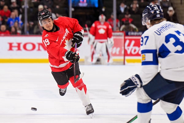 Canadian defenceman Zayne Parekh (19) shoots the puck against Finland during the second period in the third place game of the 2026 IIHF World Junior Championship tournament at Grand Casino Arena.Nick Wosika/Reuters