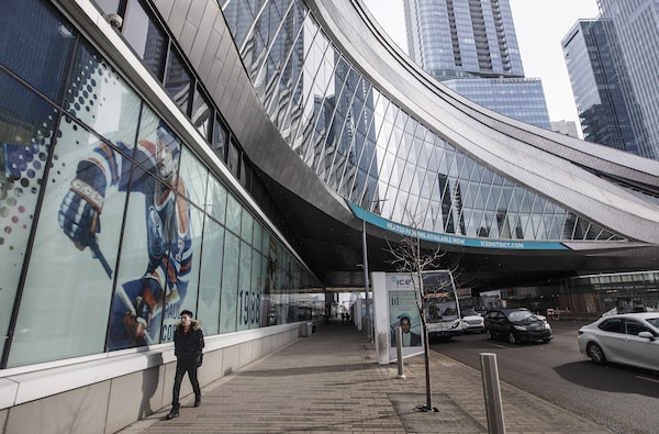 A pedestrian walks outside Rogers Place, home of the Edmonton Oilers, in Edmonton, Alta., on March 12, 2020.JASON FRANSON/The Canadian Press