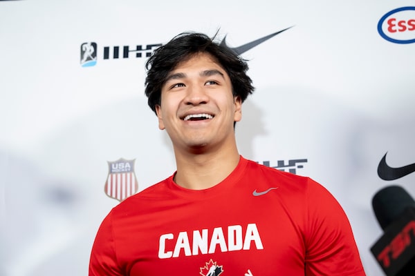 Canadian defenceman Zayne Parekh speaks to media following an optional practice at the world junior hockey championship in Minneapolis on Thursday.Christopher Katsarov/The Canadian Press