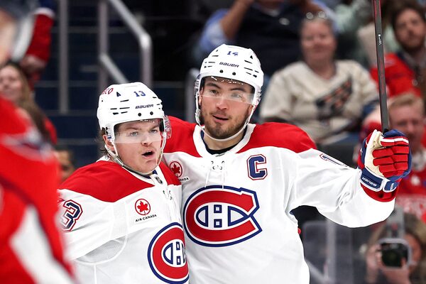 Montreal Canadiens players Cole Caufield and Nick Suzuki celebrate after scoring a goal during Game 1 against the Washington Capitals, in Washington, on April 21.Patrick Smith/Getty Images