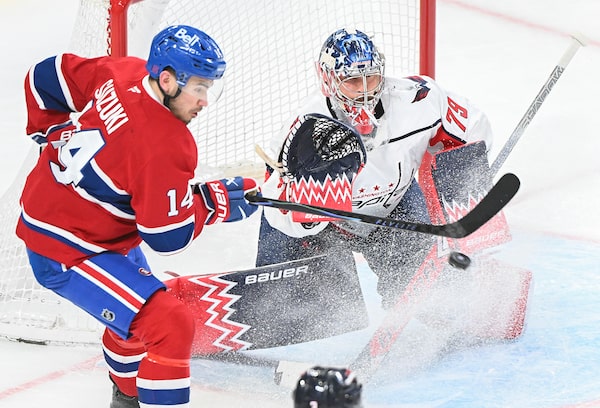 Montreal Canadiens centre Nick Suzuki (14) tries to tip the puck past Washington Capitals goaltender Charlie Lindgren (79) during their game in Montreal on Saturday.Graham Hughes/The Canadian Press