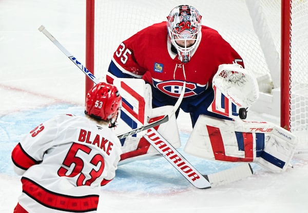 Carolina Hurricanes' Jackson Blake takes a shot on Montreal Canadiens goaltender Sam Montembeault during the first period in Montreal. The Canadiens won 4-0 on Feb. 25, 2025.Graham Hughes/The Canadian Press