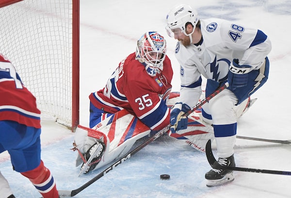 Montreal Canadiens goaltender Sam Montembeault stops Tampa Bay Lightning's Nick Perbix during the second period in Montreal. The Canadiens won 3-2 on March 21, 2023.Graham Hughes/The Canadian Press