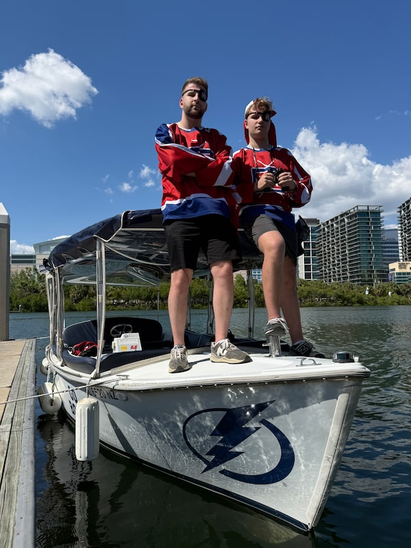 Canadiens super fans Alexander Rougas, left, and Cedrik Seguin pose on a boat in Tampa, Fla. as shown in this undated handout photo. Rougas and Seguin founded Habs Fan TV, a supporter-run social media channel.HO/The Canadian Press