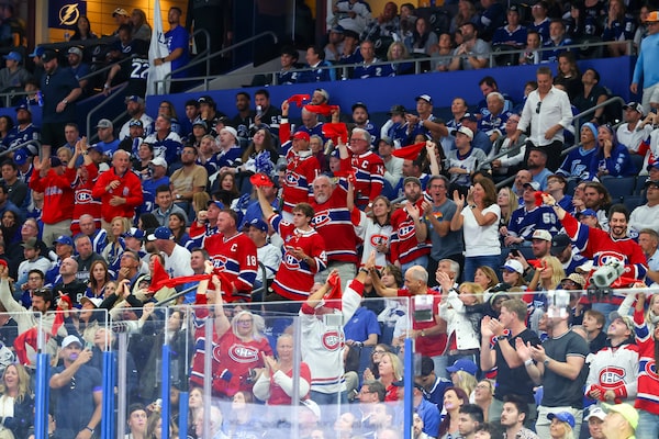 Fans of the Montréal Canadiens celebrate a goal against the Tampa Bay Lightning in the first period of Game 1 of the first round of the 2026 Stanley Cup Playoffs at Benchmark International Arena on Sunday in Tampa.Mike Carlson/Getty Images