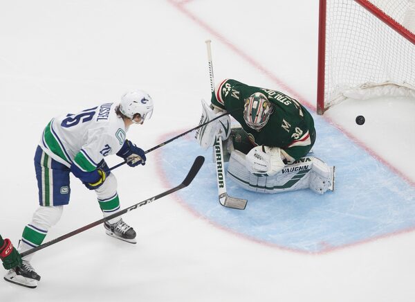 Wild defenceman Brad Hunt bobbled the puck at the Canuck blue line, allowing Roussel to race past him, grab the puck on a breakaway and shovel it on the backhand past Stalock.