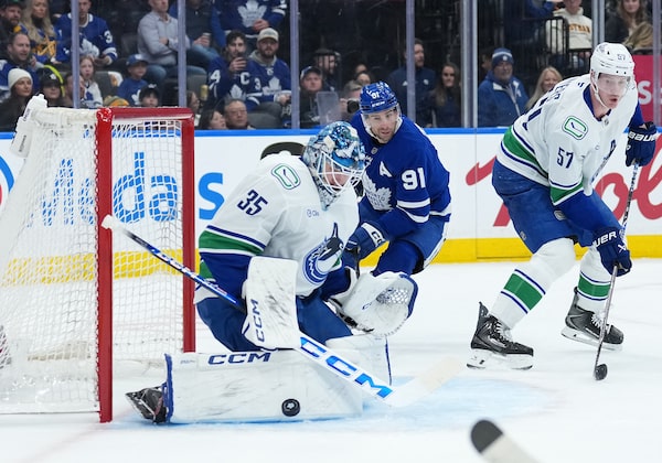 Thatcher Demko (35) stops the puck as Toronto Maple Leafs centre John Tavares (91) looks for a rebound during their December game at Scotiabank Arena.Nick Turchiaro/Reuters