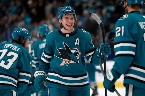 But those players had far more help than Celebrini, whose MVP case is about how much of a share of the Sharks offence he has to carry. Celebrini has a point on 46.1 per cent of goals for San Jose this season – the best mark ever for a player before turning 20 – and the second highest in the league this season to Connor McDavid’s 47.5 per cent for Edmonton headed into Tuesday night.