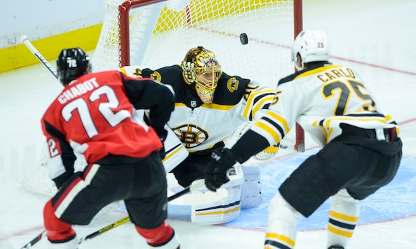 Ottawa Senators defenceman Thomas Chabot blasts a shot past Boston Bruins goaltender Tuukka Rask. The Bruins beat the Senators 2-1 on Nov. 27, 2019.Sean Kilpatrick/The Canadian Press