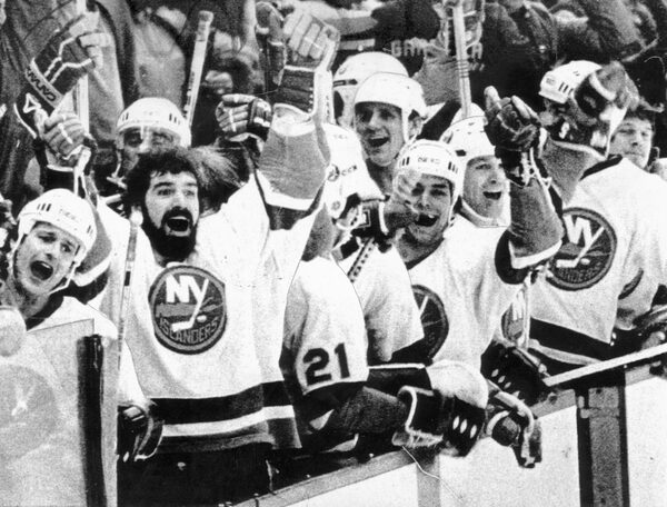 Clark Gillies, second from left, and other New York Islanders celebrate goal. John Tonelli scored with less than a minute to play to give the Islanders a 3-2 victory Feb. 20, 1982.Jack Balletti