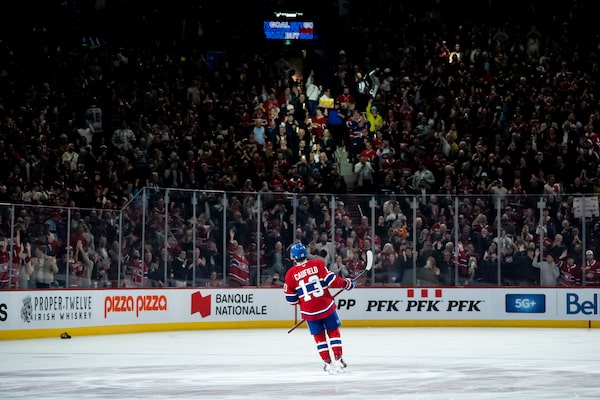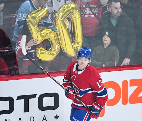 Fans cheer Montreal Canadien Cole Caufield (13) after scoring his 50th goal during Thursday's game against the Tampa Bay Lightning, in Montreal.Christopher Katsarov/The Canadian Press