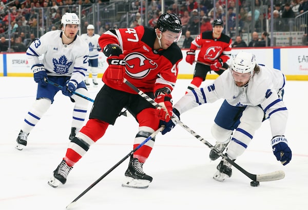 Simon Benoit #2 of the Toronto Maple Leafs defends against Paul Cotter #47 of the New Jersey Devils during the second period.Bruce Bennett/Getty Images