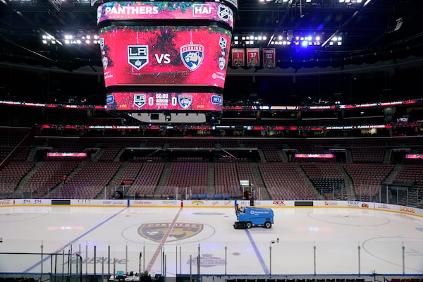 An ice resurfacer prepares the rink before an NHL hockey game between the Los Angeles Kings and the Florida Panthers, on Dec. 16, 2021, in Sunrise, Fla.Marta Lavandier/The Associated Press