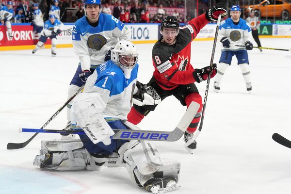 Cody Glass of Canada, right, fights for a puck with goalie Nikita Boyarkin of Kazakhstan during the group B match between Canada and Kazakhstan at the ice hockey world championship in Riga, Latvia. Canada won 5-1 on May 17, 2023.Roman Koksarov/The Associated Press
