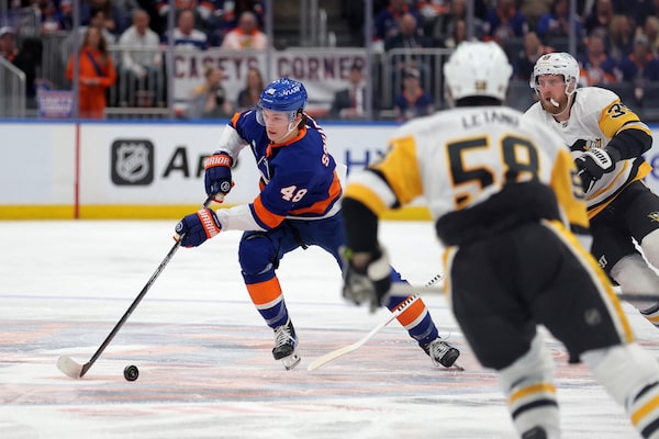 New York Islanders defenceman Matthew Schaefer (48) brings the puck up ice against Pittsburgh Penguins defenceman Kris Letang (58) and right wing Anthony Mantha (39) during a game at UBS Arena.Brad Penner/Reuters