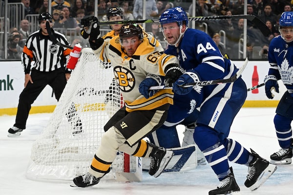 Boston Bruins left wing Brad Marchand battles for position in front of the net against Toronto Maple Leafs defenceman Morgan Rielly during the third period at the TD Garden. The Bruins won 3-2 in a shootout on Nov. 2, 2023.Brian Fluharty/Reuters