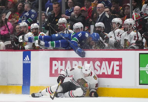 Vancouver Canucks' Dakota Joshua falls into the Chicago bench after colliding with Chicago Blackhawks' Anders Bjork during the second period in Vancouver. The Canucks won 3-0 on April 6, 2023.DARRYL DYCK/The Canadian Press
