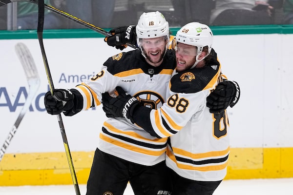 Boston Bruins' Pavel Zacha and David Pastrnak celebrate after scoring a goal during a game against the Dallas Stars, in Dallas, Tex., on Feb. 14.Tony Gutierrez/The Associated Press
