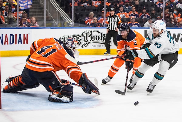 San Jose Sharks' Noah Gregor is stopped by Edmonton Oilers goalie Mike Smith as Duncan Keith defends during the third period. The Oilers won 5-2 in Edmonton on March 24, 2022.JASON FRANSON/The Canadian Press