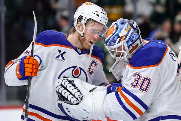Edmonton Oilers centre Connor McDavid and goaltender Calvin Pickard celebrate their team's 7-1 win against the Minnesota Wild on Dec. 12, 2024, in St. Paul, Minn.Matt Krohn/The Associated Press