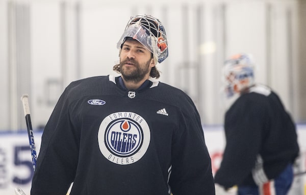 Edmonton Oilers goalie Stuart Skinner skates during practice in Edmonton on June 20, ahead of Game 6 of the NHL Stanley Cup final on Friday.JASON FRANSON/The Canadian Press