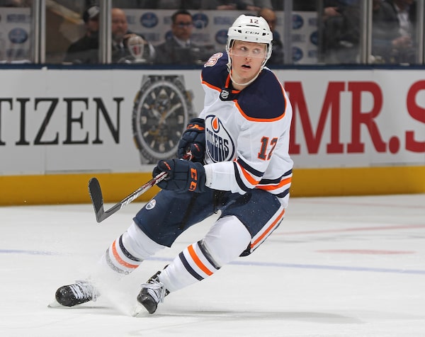 Colby Cave #12 of the Edmonton Oilers skates against the Toronto Maple Leafs during an NHL game at Scotiabank Arena on February 27, 2019 in Toronto, Ontario, Canada.Claus Andersen/Getty Images