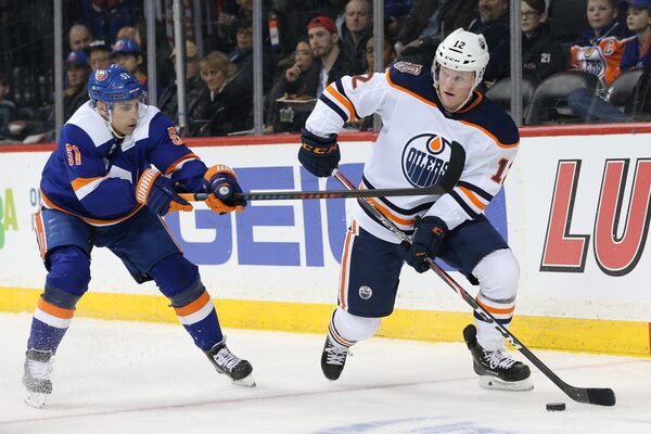 Feb 16, 2019; Brooklyn, NY, USA; Edmonton Oilers center Colby Cave (12) plays the puck against New York Islanders center Valtteri Filppula (51) during the first period at Barclays Center.Brad Penner/USA TODAY Sports via Reuters