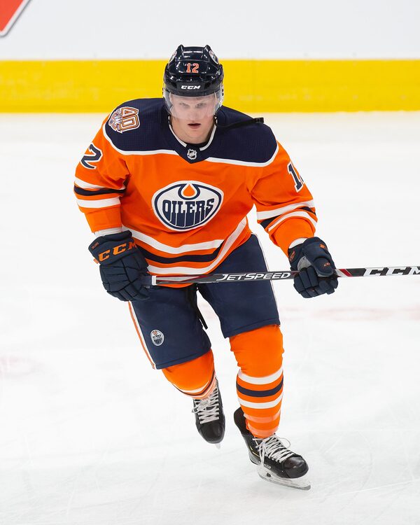 Colby Cave #12 of the Edmonton Oilers skates against the New York Rangers at Rogers Place on March 11, 2019 in Edmonton, Alberta, Canada.Codie McLachlan/Getty Images