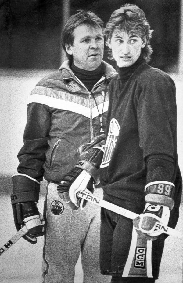 Wayne Gretzky, right, and coach Glen Sather as they watch teammates during Monday morning practice in Edmonton, May 9, 1983.The Canadian Press