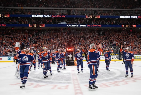 Edmonton Oilers celebrate the win over the Dallas Stars in Game 6 of the Western Conference finals in Edmonton on June 2, 2024.JASON FRANSON/The Canadian Press