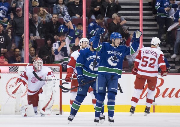 Vancouver Canucks centre Elias Pettersson (40) celebrates his goal past Detroit Red Wings goaltender Jonathan Bernier (45) during first period NHL action in Vancouver, on Jan. 20, 2019.JONATHAN HAYWARD/The Canadian Press