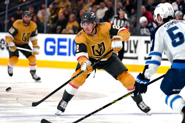 Vegas Golden Knights defenceman Zach Whitecloud passes the puck during a game against the Winnipeg Jets, in Las Vegas, on April 20.Lucas Peltier/The Associated Press