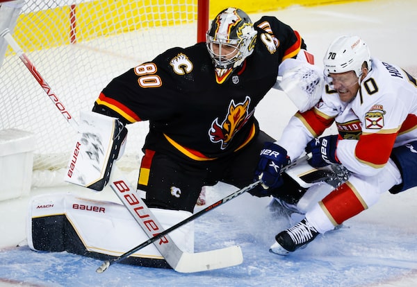 Florida Panthers forward Patric Hornqvist, right, crashes into Calgary Flames goalie Dan Vladar during the second period in Calgary. The Flames won 6-2 on Nov. 29, 2022.Jeff McIntosh/The Canadian Press