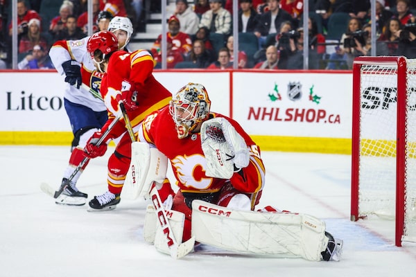 Calgary Flames goaltender Jacob Markstrom guards his net against the Florida Panthers during the second period at Scotiabank Saddledome. The Flames won 3-1 on Dec. 18, 2023.Sergei Belski/Reuters