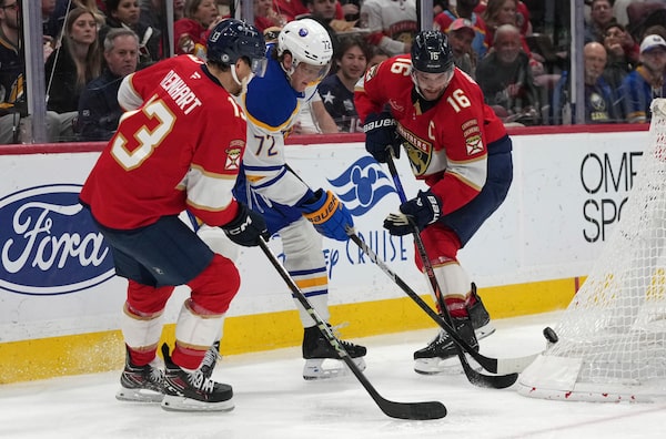 Buffalo Sabres centre Tage Thompson goes for the puck against Florida Panthers forwards Sam Reinhart and Aleksander Barkov on March 8, 2025, in Sunrise, Fla.Lynne Sladky/The Canadian Press
